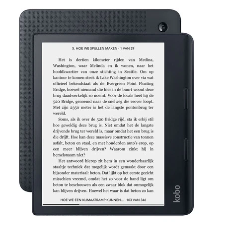 Met de Kobo Sage lees je je favoriete boeken op een comfortabele manier in één keer uit. De e-reader heeft een groot 8 inch scherm, waardoor teksten goed leesbaar zijn en je minder vaak bladzijden moet omslaan. Het scherm is bovendien rustig voor je ogen. De Comfortlight Pro schermtechnologie filtert namelijk blauw licht en past de schermverlichting en kleurtemperatuur automatisch aan op basis van het omgevingslicht. In bad of aan het strand lezen is geen probleem, want het toestel heeft een waterbestendige behuizing. Dankzij bluetooth ondersteuning luister je ook naar audioboeken op de Kobo Sage. De e-reader biedt ook ondersteuning voor de los verkrijgbare Kobo Stylus. Hiermee maak je tijdens het lezen aantekeningen of tik je gemakkelijk op een woord om de betekenis op te zoeken. Met 32 GB opslaggeheugen heb je voldoende ruimte voor een flinke digitale boekenkast van wel 30.000 boeken.