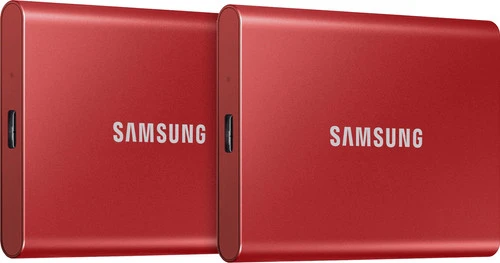 Zet je bestanden razendsnel over met de Samsung Portable SSD T7 500GB Rood – Duo Pack. Deze bundel bevat 2 snelheidsduivels met ieder een opslagcapaciteit van 500 gigabyte. Zo neem je jouw hele film- en fotocollectie mee, of maak je backups in het geval één van de schijven kapot gaat. De T7 is 2 keer sneller dan zijn voorganger, de T5. Met een leessnelheid van 1050 MB/s en schrijfsnelheid van 1000 MB/s zet je een 4K film van 50 gigabyte in minder dan een minuut op de SSD. De SSD’s zijn slechts 8,5 centimeter lang en wegen 58 gram per schijf. Zo neem je ze gemakkelijk mee in je tas of jaszak. De metalen behuizing en valbestendigheid tot 2 meter zorgen ervoor dat deze SSD’s tegen een stootje kunnen. Bijvoorbeeld wanneer ze uit je zak vallen. De T7 SSD’s werken op vrijwel ieder apparaat met een usb A of usb C poort.