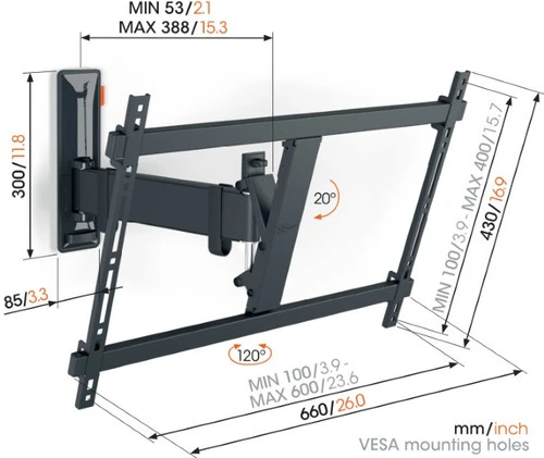 Met de Vogel’s Comfort 3625 richt je een grote tv gemakkelijk naar diverse posities. Je draait de tv eenvoudig van je bank naar de eettafel. Als je de tv hoog aan de muur wilt hangen, kantel je de beugel tot 20 graden naar beneden. Op deze manier is het scherm duidelijk zichtbaar en heb je minder last van storende reflecties op het scherm. Dankzij de level functie pas je met een knop aan de achterkant van de beugel de positie van de tv na installatie aan, zodat het scherm helemaal recht hangt. Heb je hulp nodig bij de installatie, download dan de TV Mount Guide app op je smartphone of tablet. Deze app gebruikt de meegeleverde poster als herkenningspunt, zodat je precies ziet waar het eerste boorgat moet komen. De Comfort 3625 is geschikt voor tv’s van 40 tot en met 77 inch en heeft een maximaal draaggewicht van 35 kilogram.