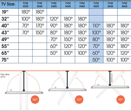 - 115 graden met een 43 inch tv, 50 graden met een 75 inch tv, 60 graden met een 65 inch tv, 70 graden met een 55 inch tv, 85 graden met een 50 inch tv