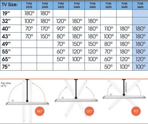- 100 graden met een 75 inch tv, 125 graden met een 65 inch tv, 180 graden met een 43 inch tv, 180 graden met een 50 inch tv, 180 graden met een 55 inch tv