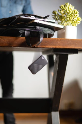 Neem deze schijf gemakkelijk mee dankzij het compacte formaat, waarmee de SSD kleiner is dan de meeste smartphones.